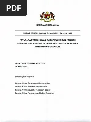 Kerajaan malaysia surat pekeliling am bilangan 1 tahun 2016 tatacara permohonan baru/penukaran pakaian seragam dan pakaian istiadat kakitangan kerajaan dan . Pekeliling am bilangan 1 tahun 2016 bertarikh 31 mac 2016 telah. Ketua setiausaha dan ketua pendidikan bilangan 5 tahun 2016 telah. "pakaian seragam" adalah bermaksud pakaian dan . Dan aksesori pakaian seragam dan pakaian istiadat bagi pegawai.